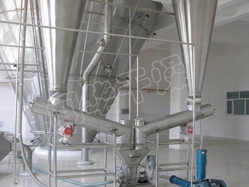 離心噴霧干燥設(shè)備是一種適用于乳濁液、懸浮液、糊狀物 、溶液等液體干燥的專用干燥設(shè)備??諝馔ㄟ^(guò)過(guò)濾器和加熱器,進(jìn)入噴霧干燥頂部的空氣分配器,熱空氣呈螺旋狀均勻進(jìn)入干燥。料液由料液槽經(jīng)過(guò)濾器由泵送至干燥器頂部的離心霧化器,使料液噴成小的物狀液滴,料液和熱空氣并流接觸,水份迅速蒸發(fā),在短時(shí)間內(nèi)干燥為成品。成品同干燥塔底部和旋風(fēng)分離器排出, 廢氣由風(fēng)機(jī)抽出排出。
